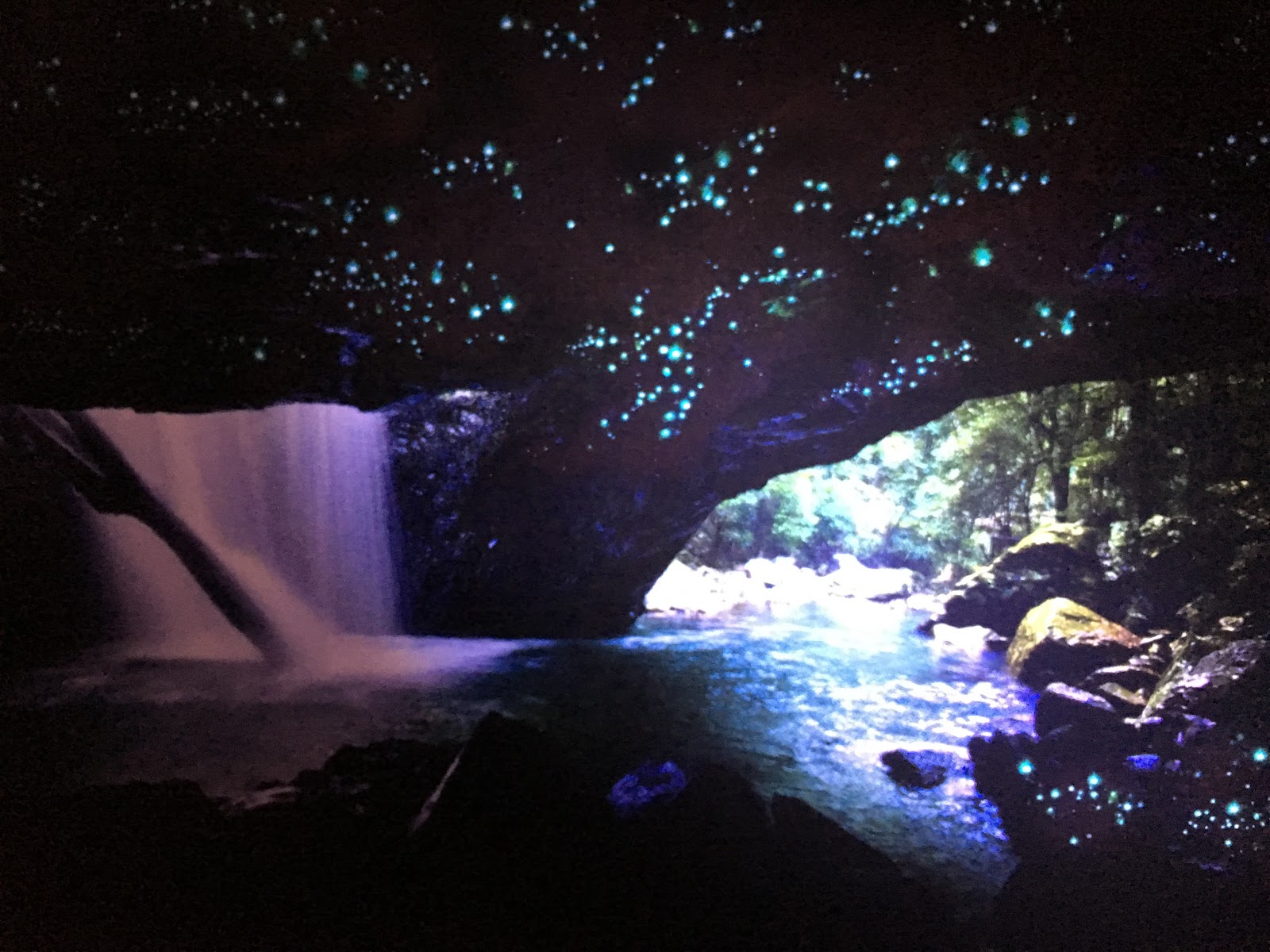 我滿心期待與他們相遇,當越接近洞穴,瀑布聲也越來越響亮,直到導遊要大家把手電筒全部關掉,眼睛向岩壁上望:天啊!藍光蟲猶如沿路伴隨的那數不清的滿天星斗,美麗的光令人想落淚啊⋯⋯