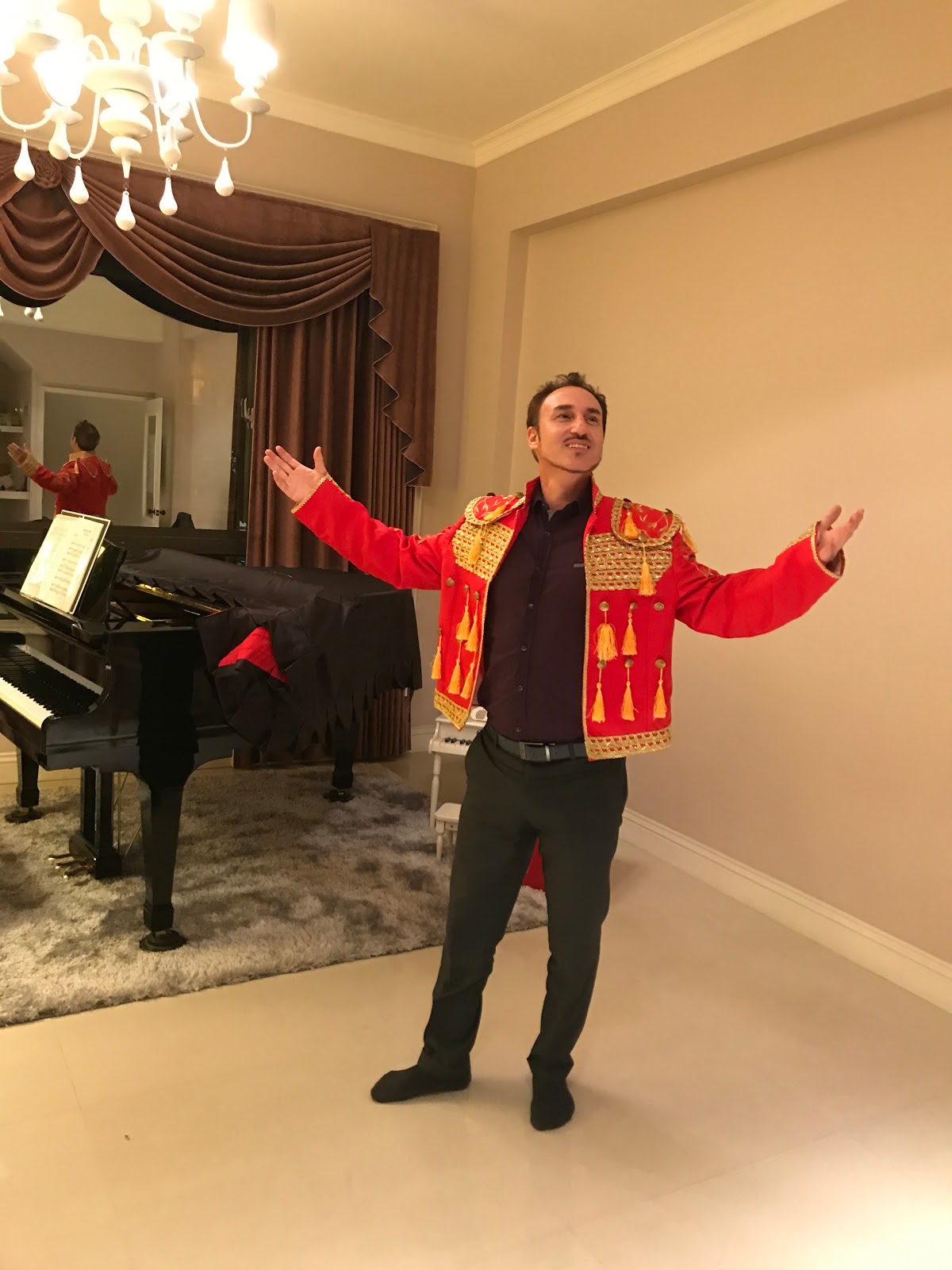 我在演出時發現理查的「音樂自由度」相當高,就是彈性速度、表情表達… 絕非照譜彈就能跟上,要完全打開耳朵,一同感覺音樂的起伏,一同在舞台上創造音樂流動的新速度!這一種幾乎「即興」感的臨場發揮除了在音樂本身,也在演出道具的呈現上!當天理查在場地看到了鋼琴的保護套,就突發奇想的拿來當作「鬥牛士之歌」的鬥牛布幔,創造十足的戲劇性。更是發現場地有主持人的收音音響箱子,有輪子,就拿來當表演舞台,站上去滑來滑去製造劇場感,邊跳還可以美聲十足的繼續唱著⋯⋯