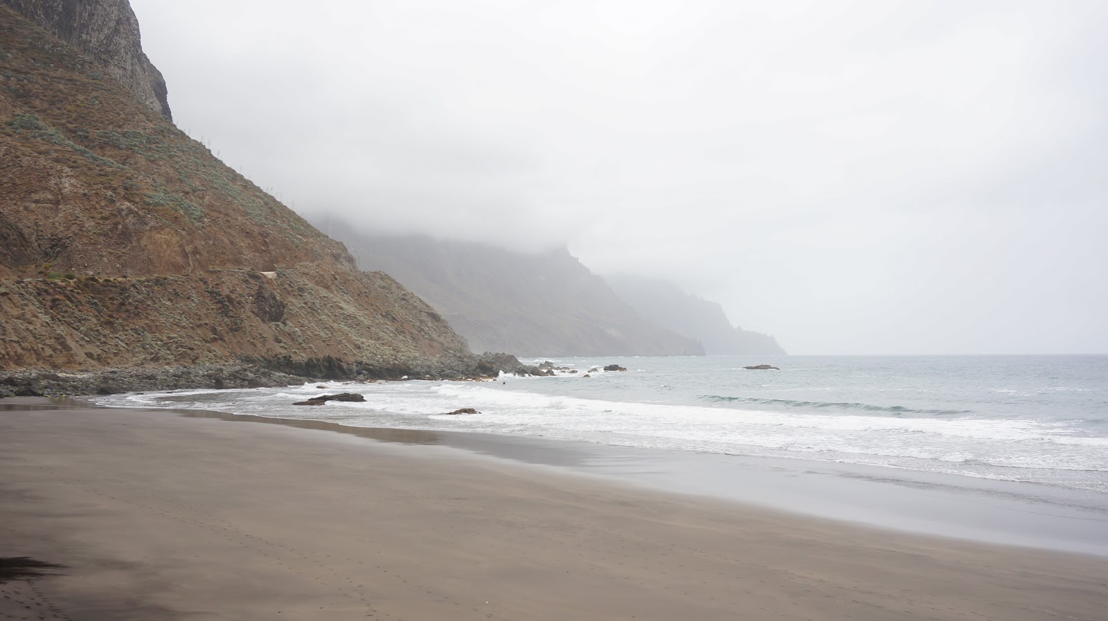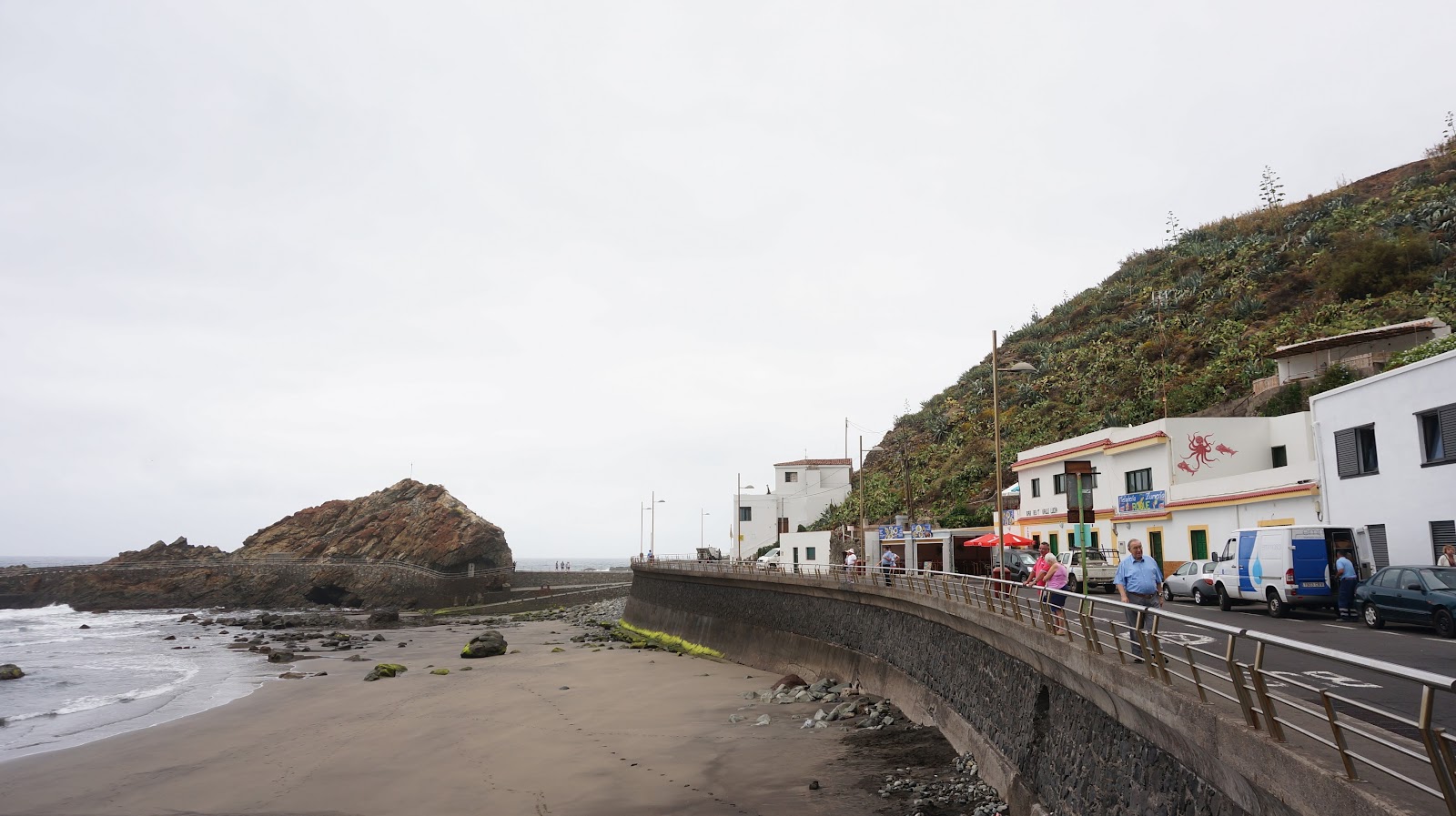 來到了Tagnana,黑色岩壁與飄著的煙嵐,黑色的海灘,灰色的海水,與幾間小小店家 |