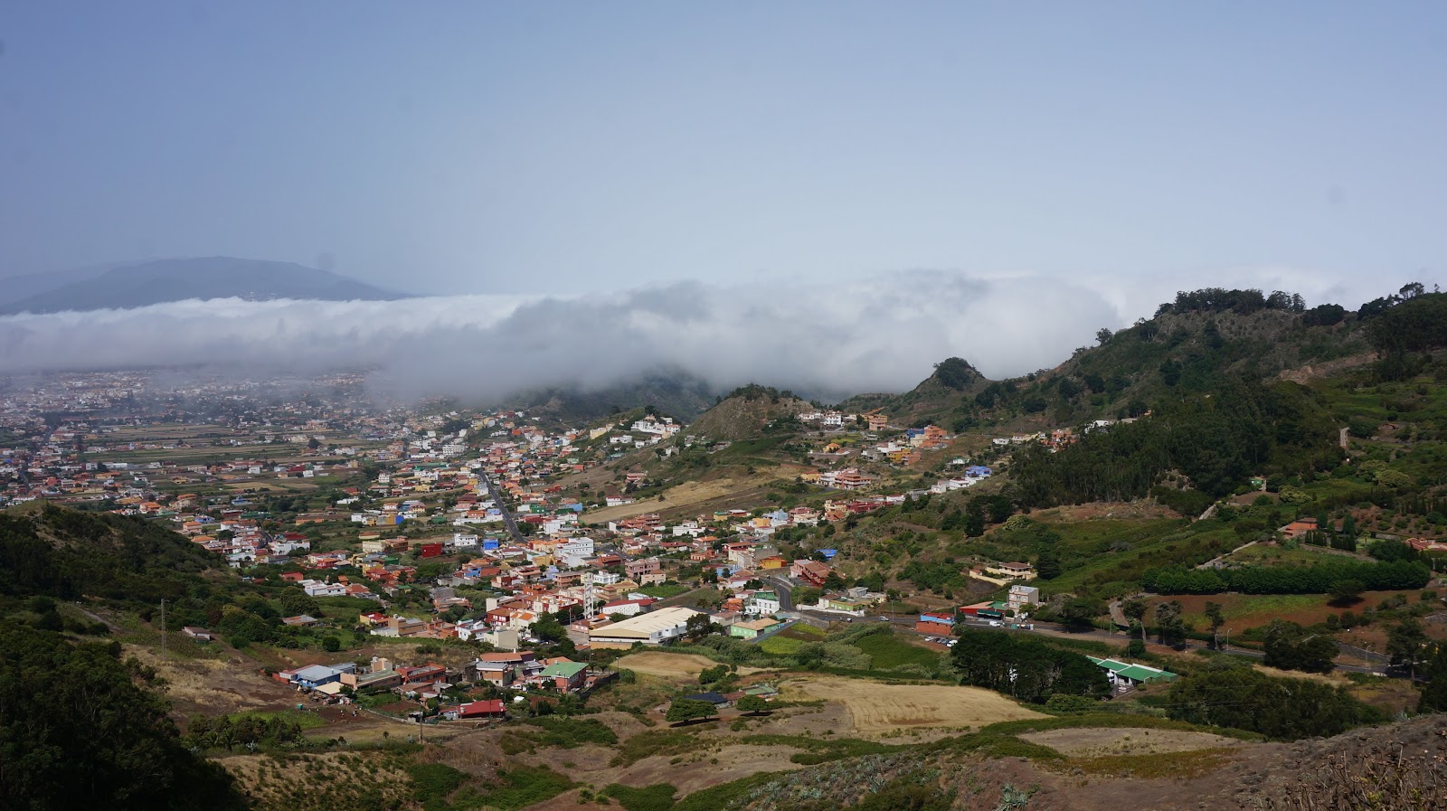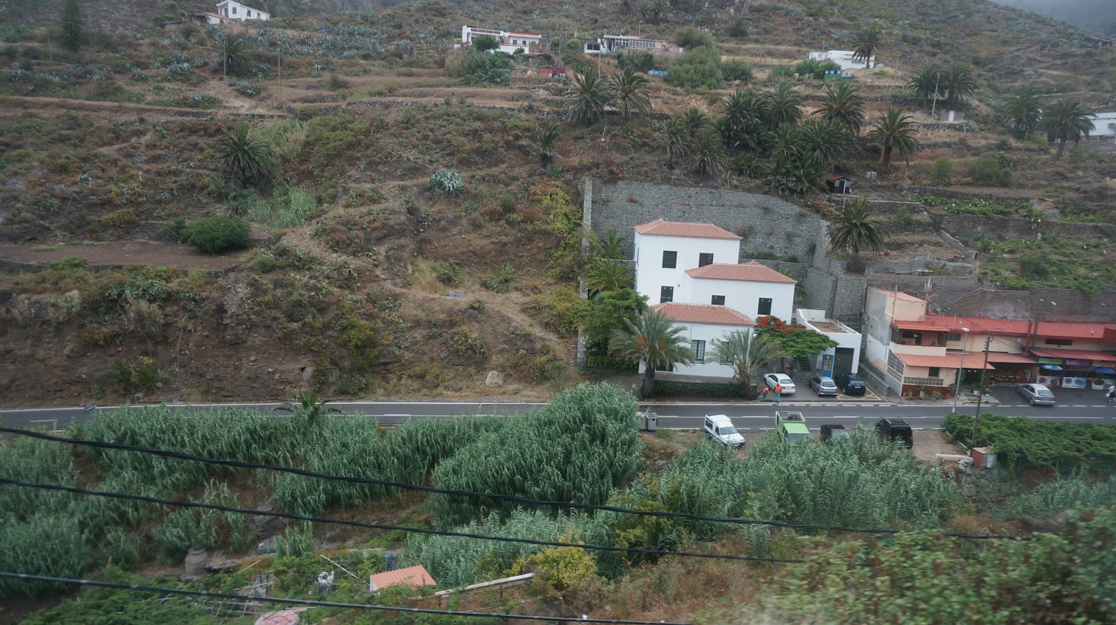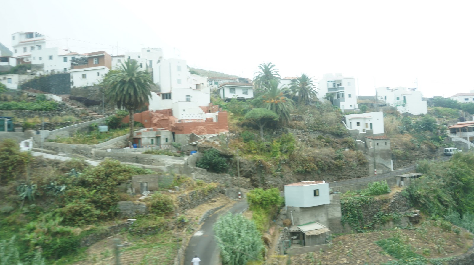 雖然驚悚,但山谷下的風景好別緻:熱帶植物之間是一塊塊四方形的彩色房子,群居的部落,撒在群山各處,而這座山是整個Canary Islands最高的一座。導遊開始解釋:「我們即將探訪一個山間小鎮Tagnana,在1960前,還沒開發這條山間道路,整個村落與世界隔絕,他們迷信山間有女巫,女巫每晚會在森林中出現兩次,圍著圓圈點著火柱,邀請Lucifer(路西華,罪惡天使)的到來。女巫們邊跳舞邊吃magic mashroom與ivy poison(毒藥),然後毒藥很快就能吸收,他們就會飛上天。這樣的傳說,使得村落人們不敢夜行森林,他們相信大地之母的魔力,崇拜自然(just like Celtic),連他們所蓋的房子,顏色也只能是紅色、黃色、綠色與白色,這樣的顏色才能與大地之母融合…。」車子邊開,我透過熱帶雨林的縫隙觀看山谷裡散落的人家,他們的顏色,不正與森林融合的如此美妙嗎!導遊繼續指著遠方的房子說:「部落的人們以前都住在洞窟裡,直到葡萄牙人們來到這裡,教他們蓋房子,但卻發現,葡萄牙人的房子並不一定適合這樣的地形與他們的生活習慣。所以,你們看,這裏的房子,一半蓋在山裡是洞窟,另一半蓋在外面的是房子,家與大地,緊緊相連一起。」