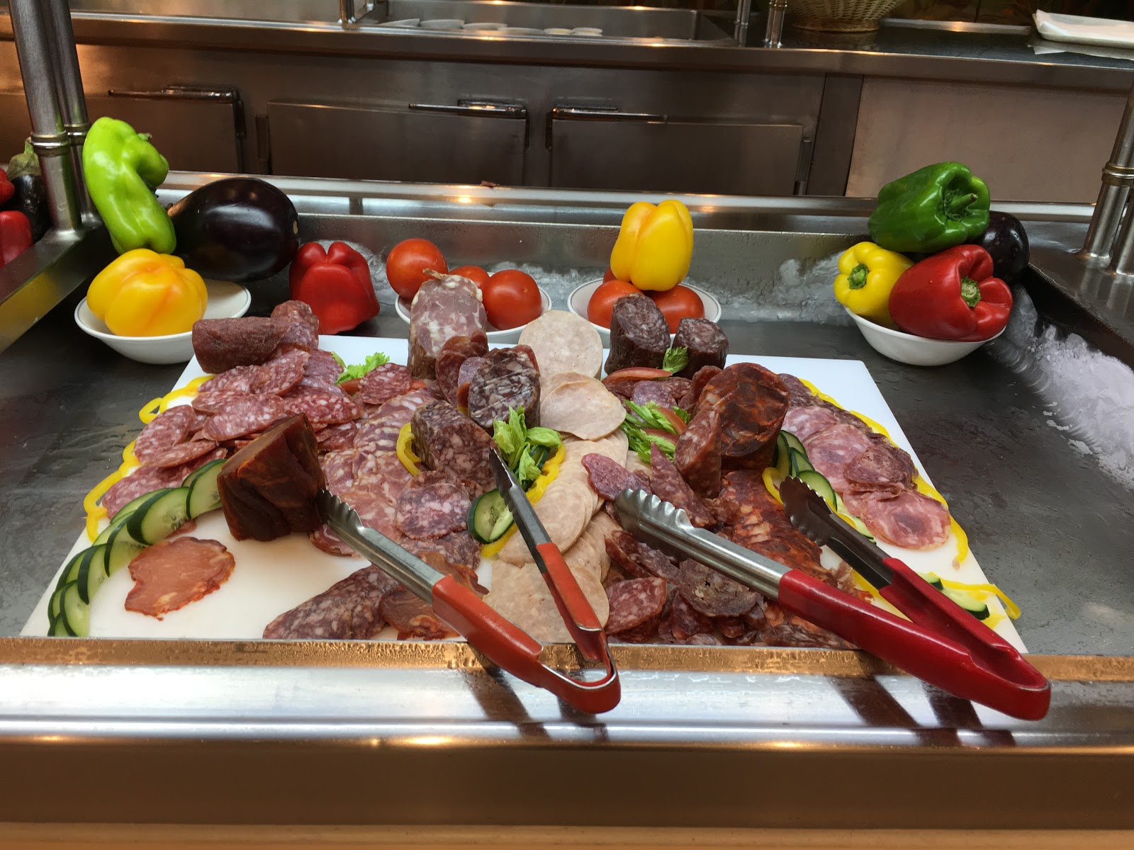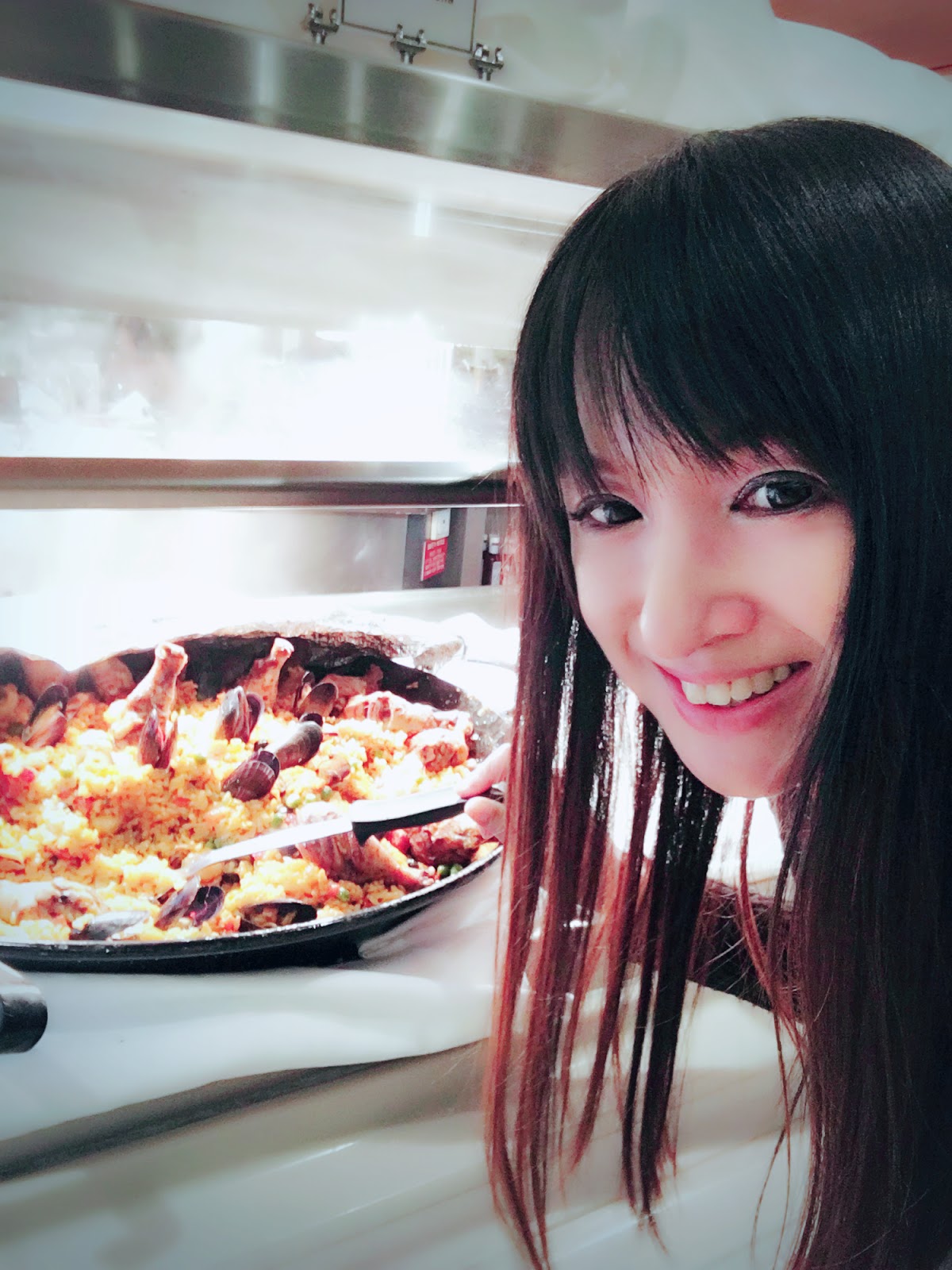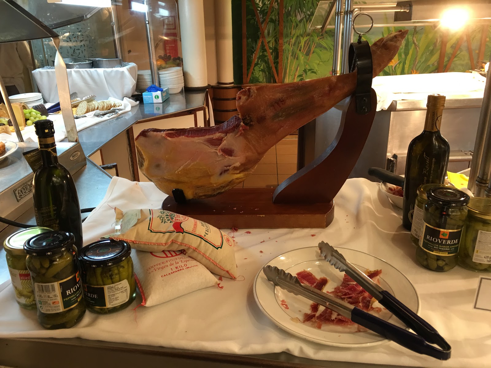 (後記:當晚,郵輪晚餐來了個「西班牙盛宴」,餐廳佈置成Spanish Tavern, 把我沒有吃到沒有滿足的Tapas午餐,全部加倍還給我啦!看看這琳琅滿目的火腿、番茄蒜頭「涼湯」(對!西班牙實在太熱連湯都要做涼的)這一大盆海鮮燉飯、各式招牌小蝶餐Tapas… 海上pianist當晚在難以言喻的身心飽足中入眠…)