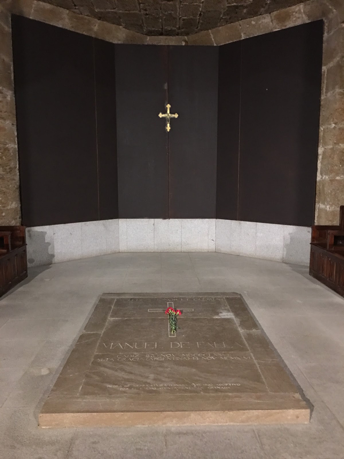 看完Falla的墓窖,似乎完成心目中一件大事,雖然我沒彈過幾曲法雅的音樂(似乎只有在學生時代與我的小提琴摯友Meg合奏過<西班牙舞曲>,那時覺得這曲明快的節奏,得要默契絕佳,鋼琴與小提琴才能對得上,而且還有種競奏感),不過法雅那種正宗的西班牙風味一直藏在心頭。也許方才外頭經驗到的佛朗明哥舞蹈,比這個墓窖更能體現他的韻律與音樂精神吧!
