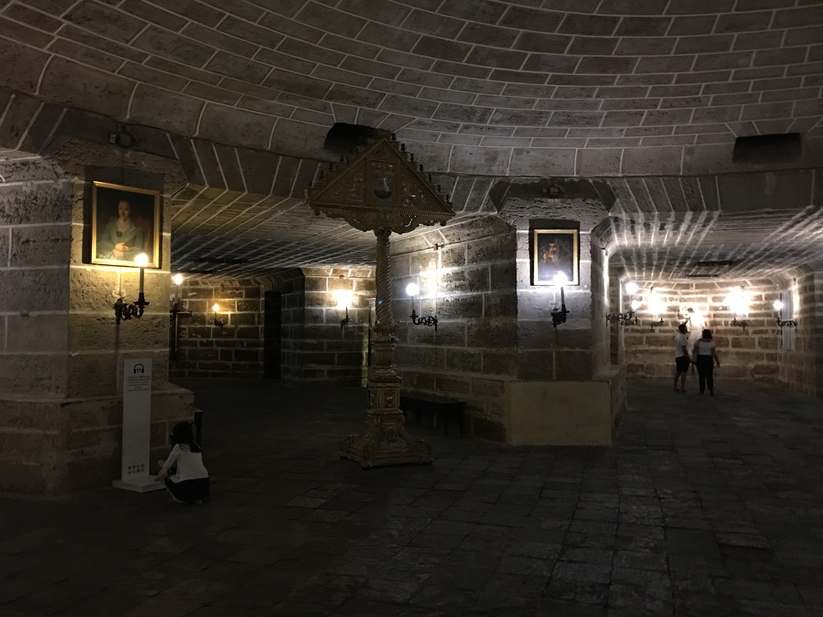 加德斯聖十字主教座堂(Catedral de Santa Cruz de Cádiz)是羅馬天主教加的斯教區的主教座堂。教堂在1260年就建成,但因1596年大火燒毀,直到1776年才在原址重建,長達116年重建時間,所以現在風貌是巴洛克加上洛可可元素,又融合新古典主義風格,真是龐大又精緻的藝術創造啊!(當時建築師Vicente Acero曾經設計了Granada主教座堂。)尤其迴廊小聖堂的巴洛克動感風格的雕刻與繪畫,每個Chapel都如同藝術品一般的雕琢,真的是美不勝收!但我特別想探訪其地窖,因為埋葬著作曲家法雅(Manuel de Falla )和詩人José María Pemán,他們都出生於Cadiz。