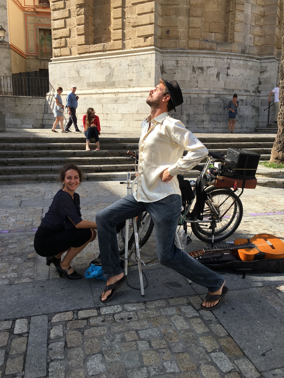 踏上廣場,耳聞吉他聲越來越響,街頭藝人演奏Granados的音樂還真是正宗西班牙南部的風味啊!「何不把這它放入隔天的郵輪獨奏會曲目裡」,我在吉他手的指尖探索著西班牙風情,試圖沾染… 不過,這不是唯一的吉他聲,我腳步隨著另一串熱情音樂走去,在大教堂廣場上,另一名吉他手又唱又彈,而且他的女伴就在一旁上演著火熱的:Flamenco!我朝向他們奔去,這組演出默契好的自然,身形與音樂都非常專業。我一曲又一曲欣賞,女孩身體隨著舞步似乎進入另一種時空,他們的專業度讓我滿心歡喜大呼過癮,實在佩服這種風格獨具的舞蹈形式!