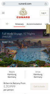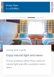 費用:通常公司會給我Ocean View 海景房,接下來這趟是環遊世界117天的航程,Queen Anne的一人一趟是 £20999 起… (不過我只有演出其中的兩週,共四場獨奏會)如果不環遊世界,兩週的行程就 約 每人 £2600, 與Fred Olsen差不多呢!