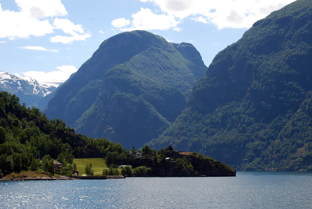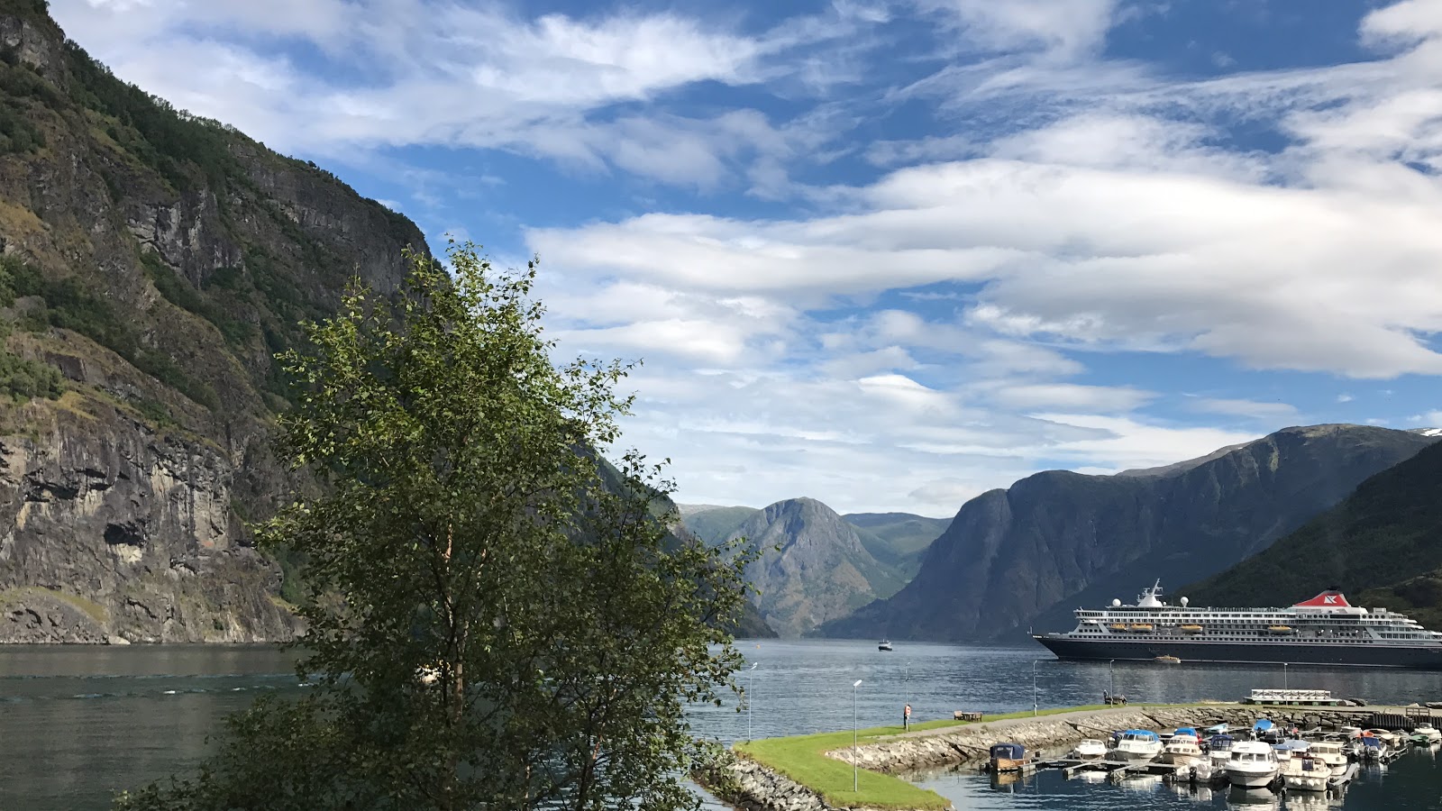 此刻,船長廣播,與旅人們對話:「現在我們航行在松恩峽灣(Sognefjorden),它全長205公里,是挪威第一長,世界第二長的峽灣, 也是最受歡迎的航線。接下來我們即將駛入其分支:納柔依峽灣(Nærøyfjord),它在2005年被聯合國教科文組織列為世界遺產,全長17公里,最窄處的水面僅有300米寬,也是世界地理雜誌列為世界保存最好的第一名自然景觀。」