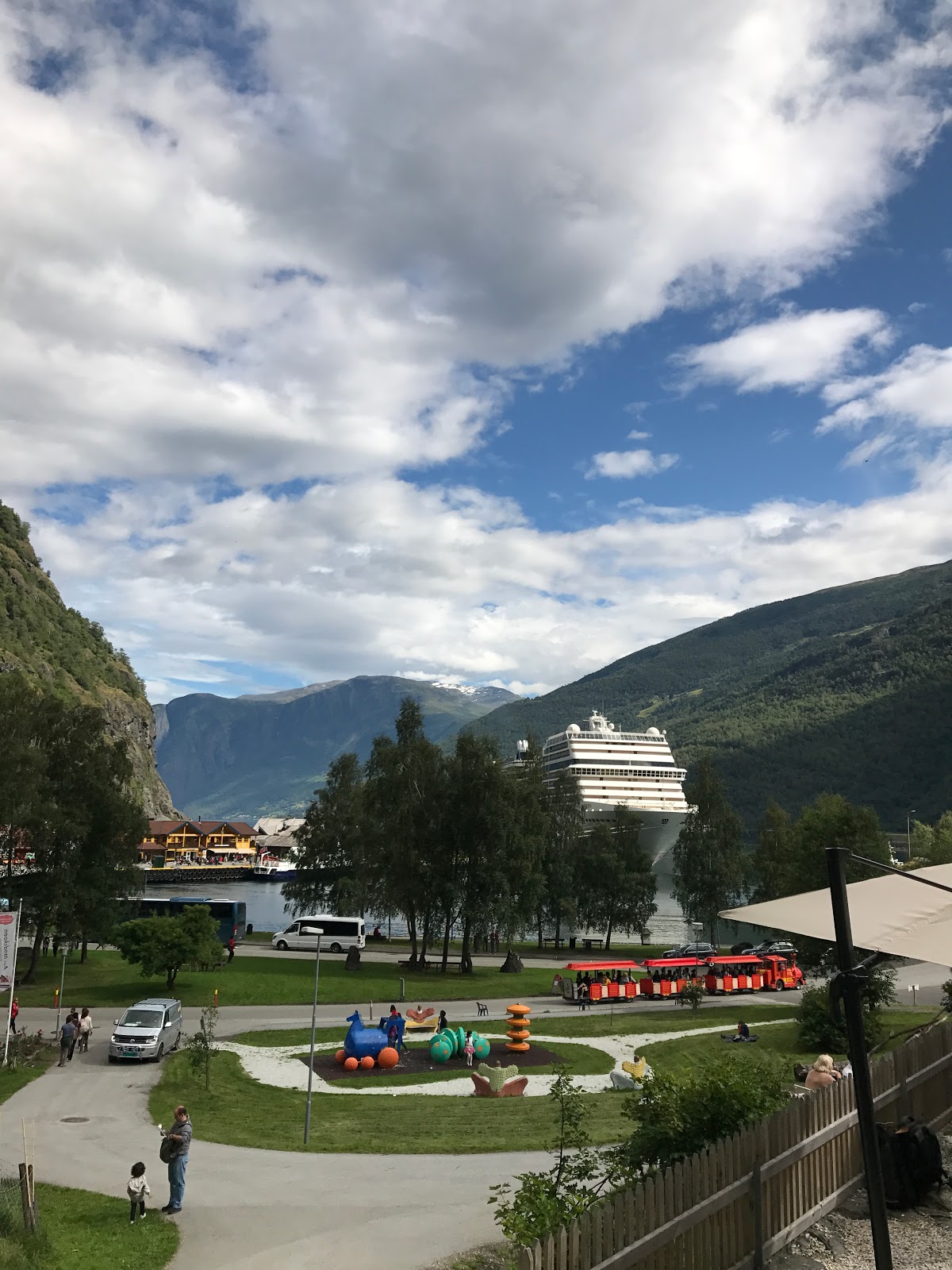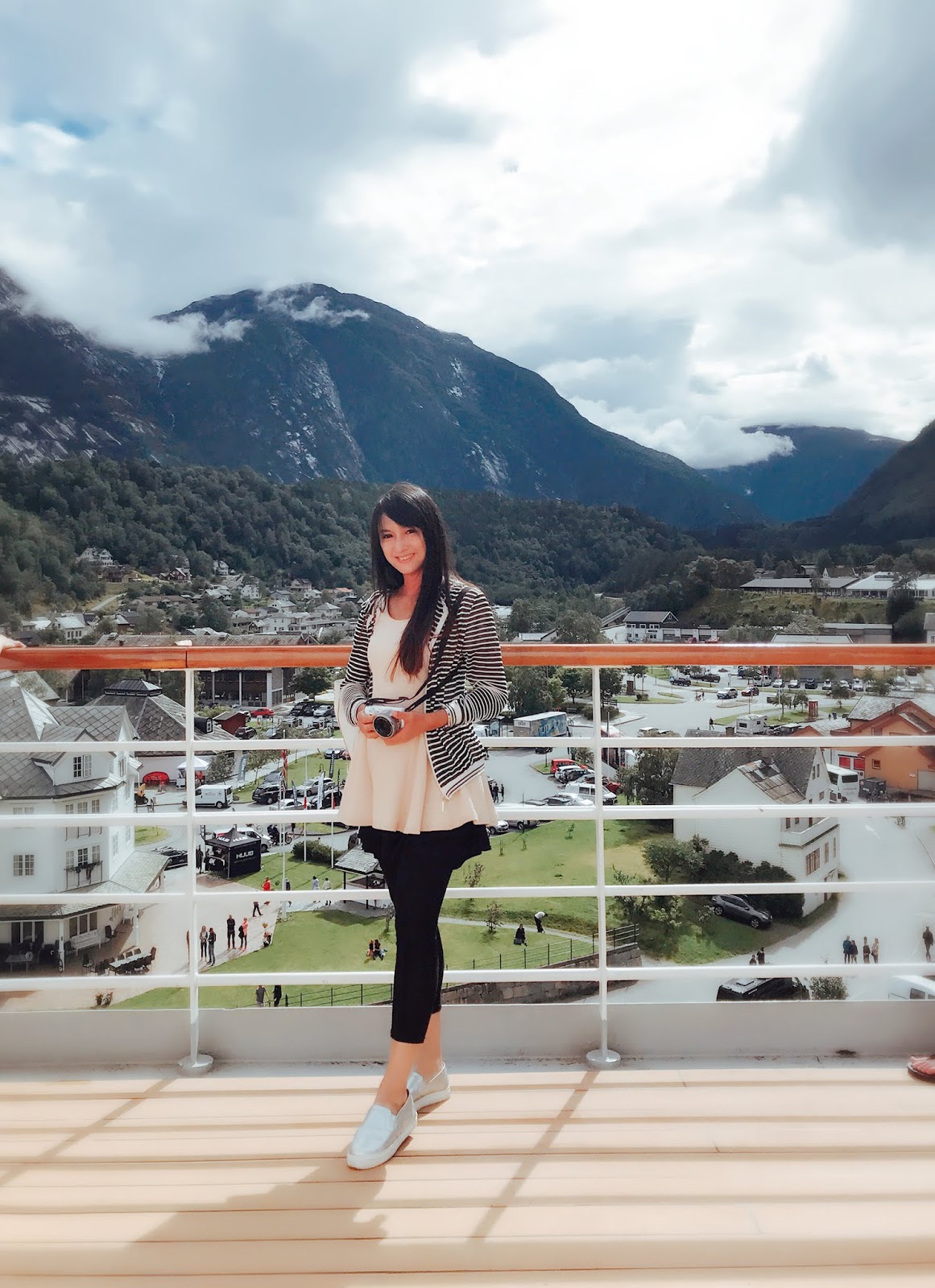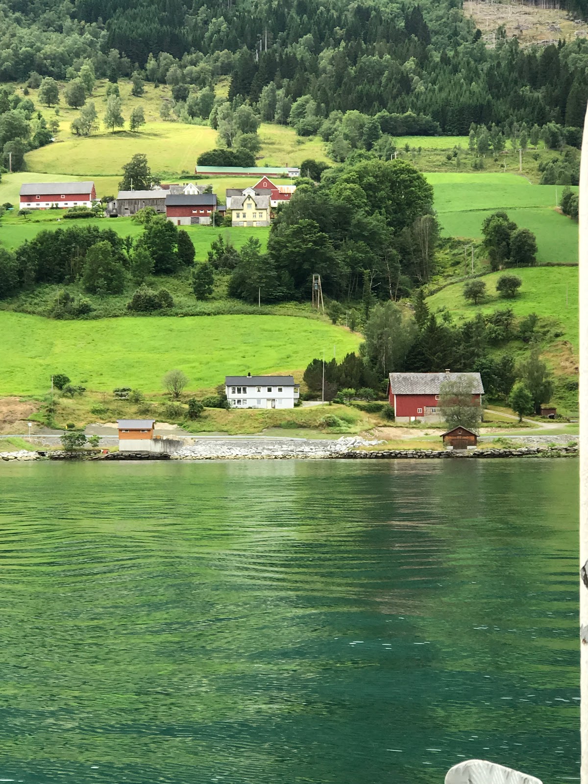 隔天清晨,陽光透入船艙的小圓窗曬醒我。望向窗外,一幅詩意靈動的水漾景緻,讓我的雙眼也閃爍著驚奇。原來的大水灣變成小溪,山林間的彩色木頭房屋,憑添溫馨。調整一下時空,這裏是… Flam(弗洛姆小村莊),我們停泊的第一站!連日來的峽灣的航行,駛在澄澈灣波裡、穿梭於奇嚴峻石之間,我懾服於大地鬼斧神工之絕妙,卻沒想到,停泊在小村莊時,眼前的清麗風光,散發一股娟秀的靈性,讓人傾心的舒暢,有別於航行間的壯美,不再令人畏懼。