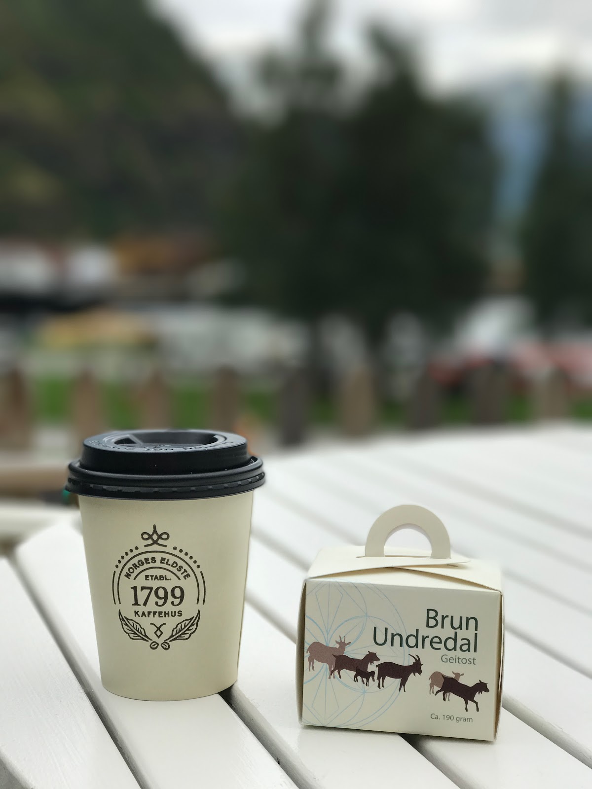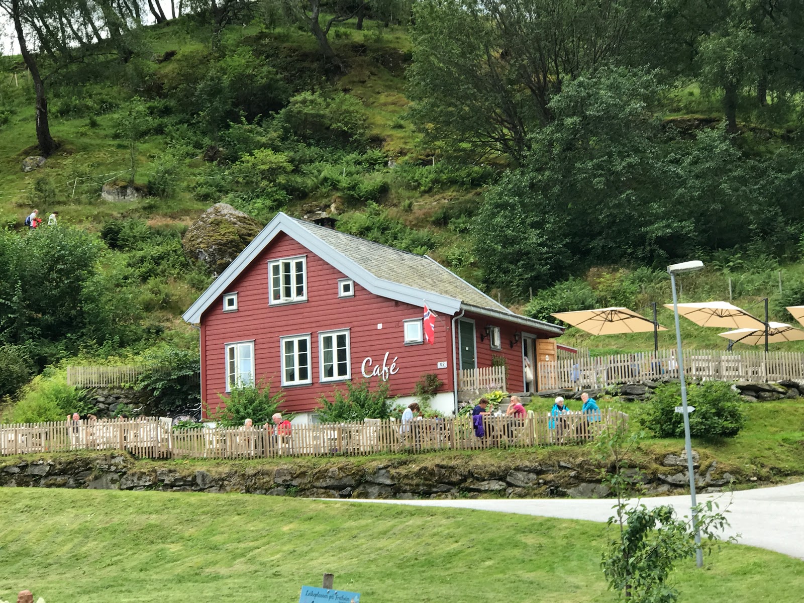 走出Ægir餐廳,我往山頭走去。因為那邊大大地寫著CAFE,綠林間的山中紅木屋,這個咖啡座真是依山半水!它是典型的挪威現代木屋,木頭橫式的建築模式與Ægir餐廳的木板垂直功法剛好相反。從高處望向眼前的峽灣,還有遠方我的郵輪,在仙境中停歇顯得特別優雅。於是,我點了一杯挪威的黑咖啡,享受接下來的挪威時間。