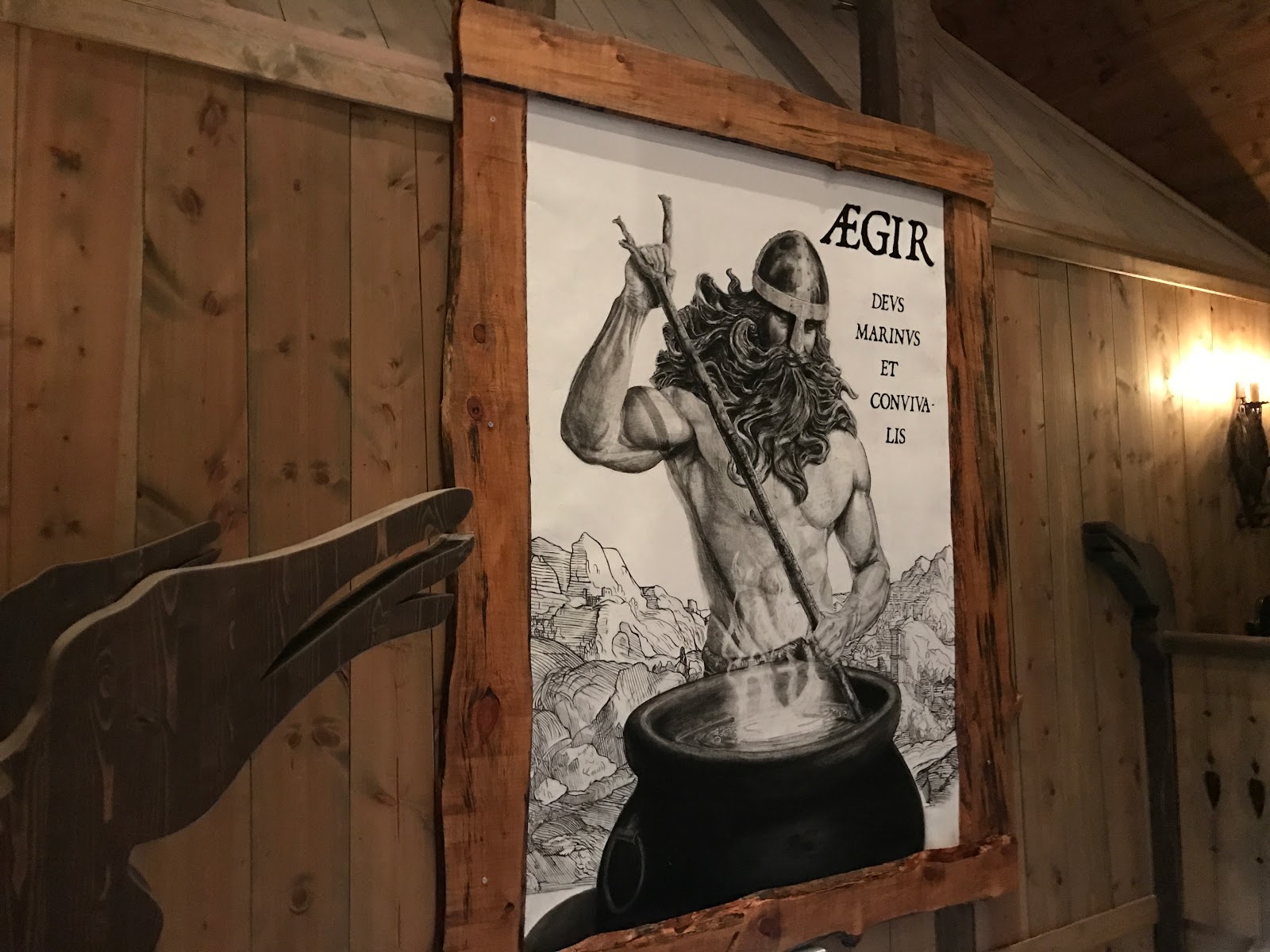 服務生指著牆上的畫:「這位就是Ægir。妳有聽說過北歐神話嗎!?跟希臘羅馬神話故事完全不一樣,北歐神話有自己的神,掌管不一樣的東西,神話中,Ægir是一位巨人,他的兄弟Kari是風神、Logi是火神,而他是海神。他的殿堂總是閃耀,不是以火為燈,而是用金塊來點亮。而且他很會釀麥酒。以神話為靈感,我們的釀酒廠就以各種口味的麥酒出名,還有淡啤酒也在挪威各地大受歡迎喔!」
